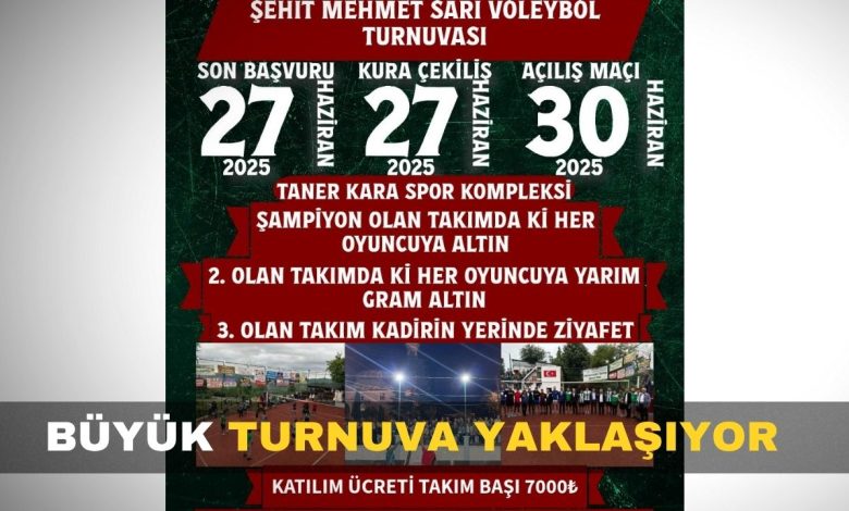 Bu yıl dördüncüsü düzenlenecek olan Şehit Mehmet Sarı Voleybol Turnuvası’nın Taner Kara Spor Kompleksi’nde oynanacağını söyleyen Başkan Usame Akbıyık, başvuruların alınmaya başlandığını, 27 Haziran’da başvuru işlemlerinin bitmesinin ardından kura çekimi yapılacağını ve ilk karşılaşmanın 30 Haziran’da olacağını ifade etti. Takımların katılım bedeli olarak 7 bin TL ödeme yapacağı da ifadelere eklendi.