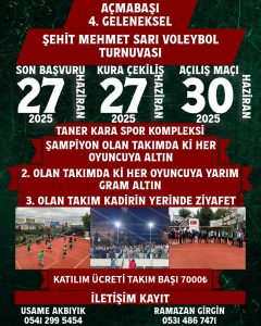 Kocaali Açmabaşı Mahallesi’nde geleneksel hale getirilen voleybol turnuvası için geri sayım başladı. Birinci olarak turnuvayı tamamlayan takımdaki tüm oyunculara altın hediye edileceğini belirten Açmabaşı Hemşinliler Derneği Başkanı Usame Akbıyık, son başvuru tarihinin 27 Haziran 2025 Cuma olduğunu belirtti.