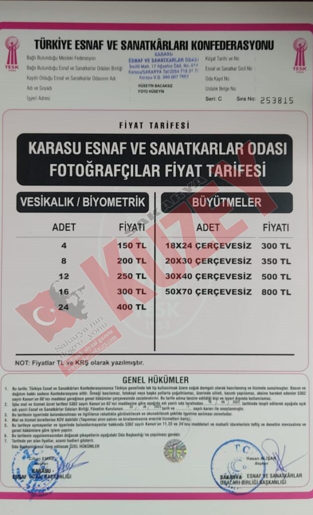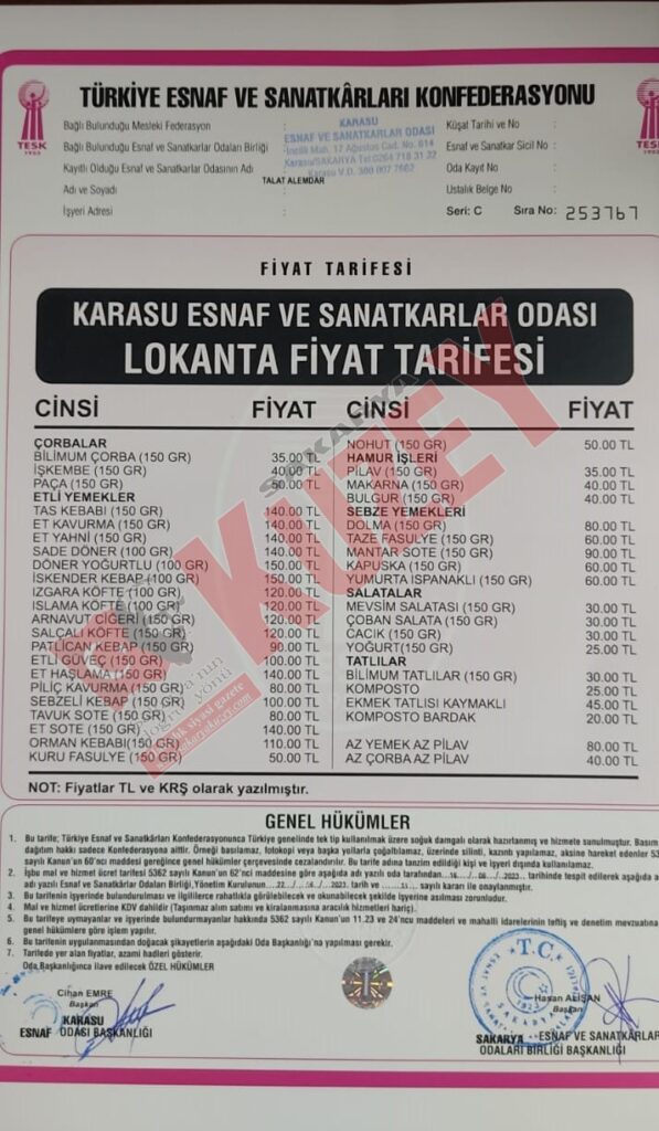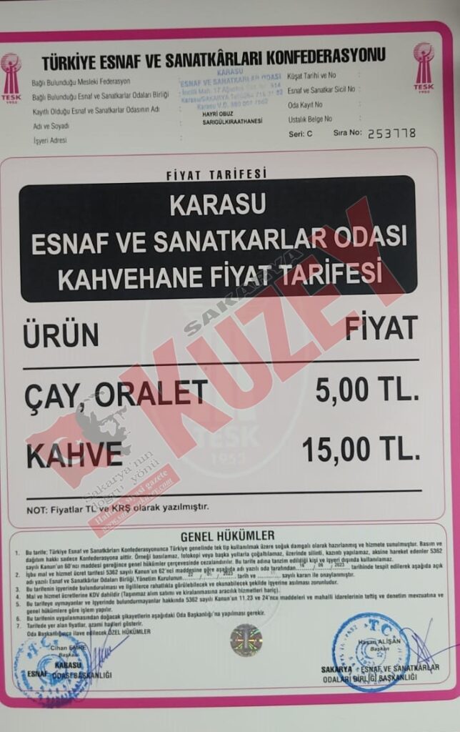 Karasu Esnaf ve Sanatkarlar Odası tarafından açılanan fiyat listesine göre, çay fiyatlarına yüzde 42 zam gelerek 3.50 TL’de 5.00 TL’ye yükselmiş olup kahve fiyatı 15.00 TL olarak belirlendi. Fotoğrafçılar fiyat tarifesinde vesikalık fotoğraf fiyatları, 4 adeti 150 TL, 8 adeti 200 TL, 12 adeti 250 TL, 16 adeti 300 TL, 24 adeti ise 400 TL olarak belirlendi. Lokanta fiyat tarifesine göre çorbalar 35.00 TL’den, etli yemekler 50.00 TL’den, hamur işleri 35.00 TL’den, sebze yemekleri 60.00TL’den, salatalar 30.00 TL’den, tatlılar ise 20 TL’den başlıyor.