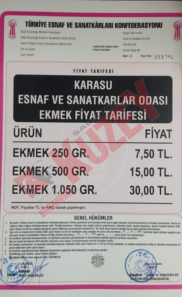 Karasu Esnaf ve Sanatkarlar Odası Başkanı Cihan Emre, bugün itibariyle ekmek fiyatlarına yüzde 50, çaya ise yüzde 42 zam geldiğini açıkladı.