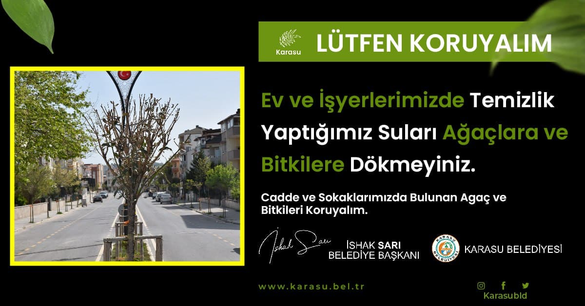 Yapılan açıklamanın devamında, “Dikilen ağaçların bakımları ve uzun yıllar sağlıklı bir şekilde gelişim gösterebilmeleri için düzenli periyotlarla uyguladığımız çalışmalar sırasında ev ve iş yerlerinde temizlik amacıyla kullanılan su atıklarının şehir içindeki ağaçlandırılmış bölgelerde ağaç ve bitkilere dökülmesi sebebiyle buralardaki ağaçların zarar gördüğü hatta kuruduğu tarafımızca tespit edilmiştir. Değerli Karasulu hemşehrilerimizin bu konuda hassasiyet göstererek bitkilere zarar verecek uygulamalardan uzak durmalarını önemle rica ederiz” ifadeleri kullanıldı.