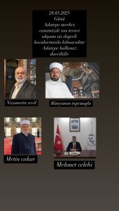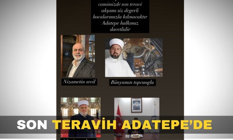 28 Mart 2025 Cuma günü Adatepe Mahallesi’ndeki Adatepe Merkez Camii’nde Karasu İlçe Müftülüğü bünyesinde bulunan hocalardan Nizamettin Sevil, Bünyamin Topçuoğlu, Metin Çakar ve Karasu İlçe Müftüsü Mehmet Çelebi son teravih akşamında Adatepe sakinleri ile bir araya gelecek.